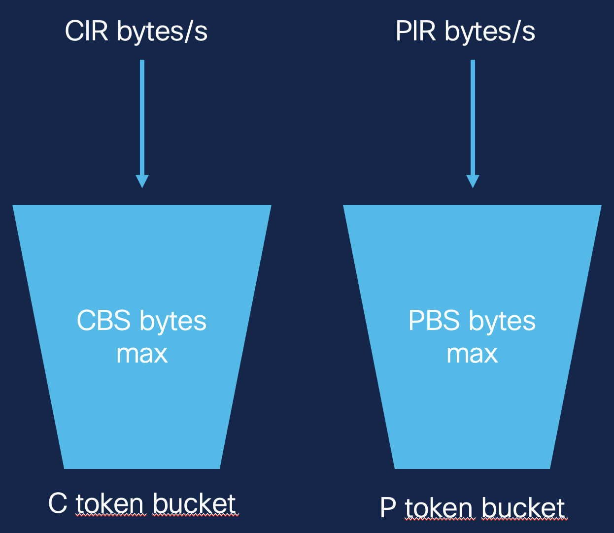 The committed token bucket (C) is filling up at CIR tokens (bytes) per second, up to CBS tokens. In the meantime, the peak token bucket (P) is filling up at PIR tokens per second, up to PBS. All overflowing tokens from C and P are lost.