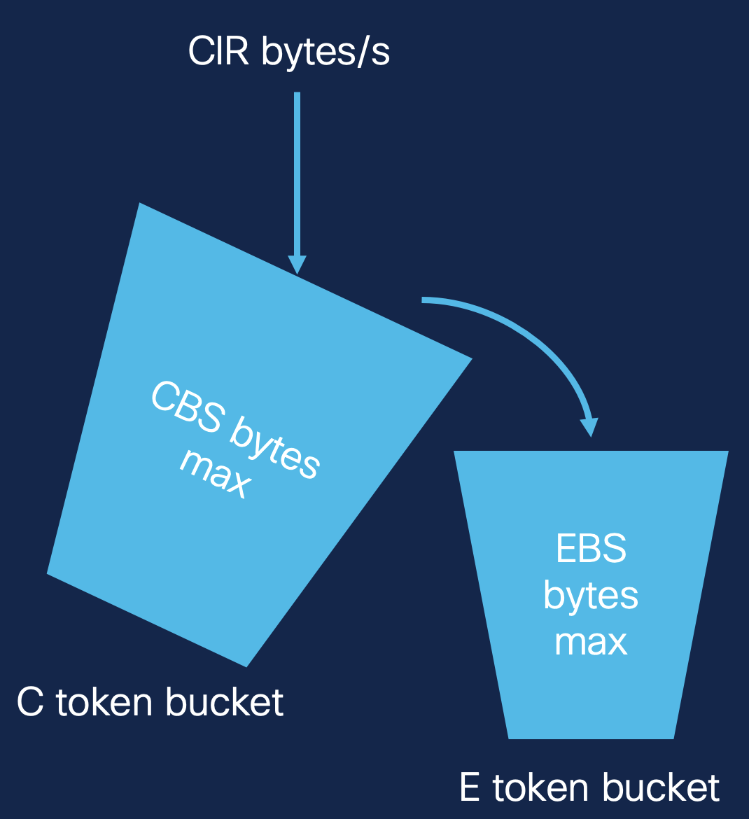 The committed token bucket (C) is filling up at CIR tokens (bytes) per second, up to CBS tokens. When C is full, tokens are overflowing into the excess token bucket (E), up to EBS tokens. Only overflowing tokens from E are lost.