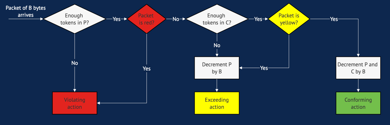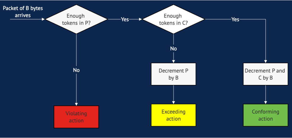The committed token bucket (C) is filling up at CIR tokens (bytes) per second, up to CBS tokens. In the meantime, the peak token bucket (P) is filling up at PIR tokens per second, up to PBS. All overflowing tokens from C and P are lost.